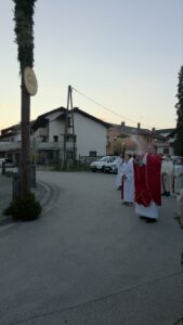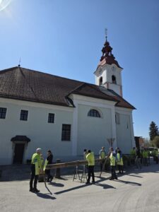 Ko je bila butara dokončana, je sledil še zahteven prenos pred cerkev, kjer smo jo s pomočjo gasilcev in dvigala varno postavili. Zvečer je župnik v okviru obreda cvetne nedelje, butaro blagoslovli.