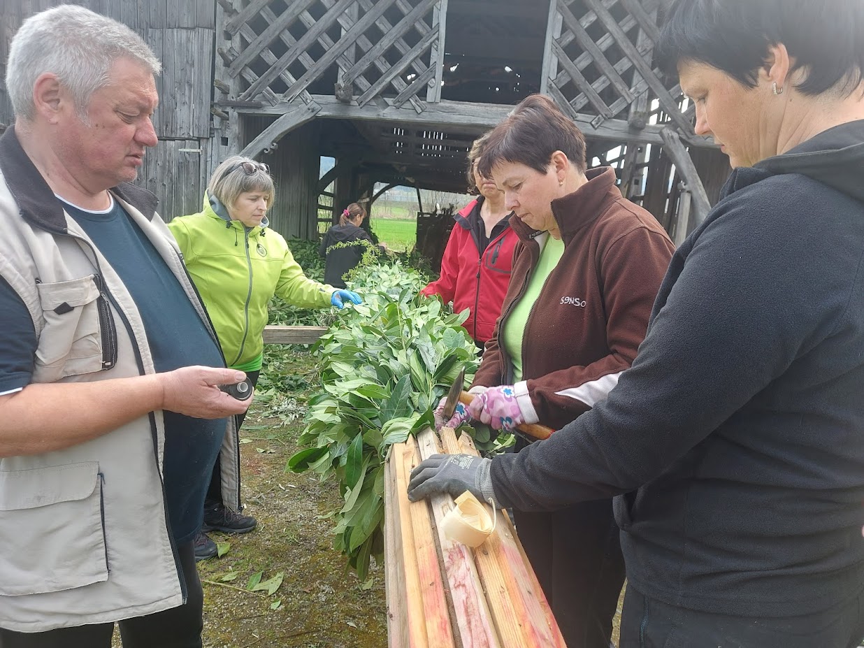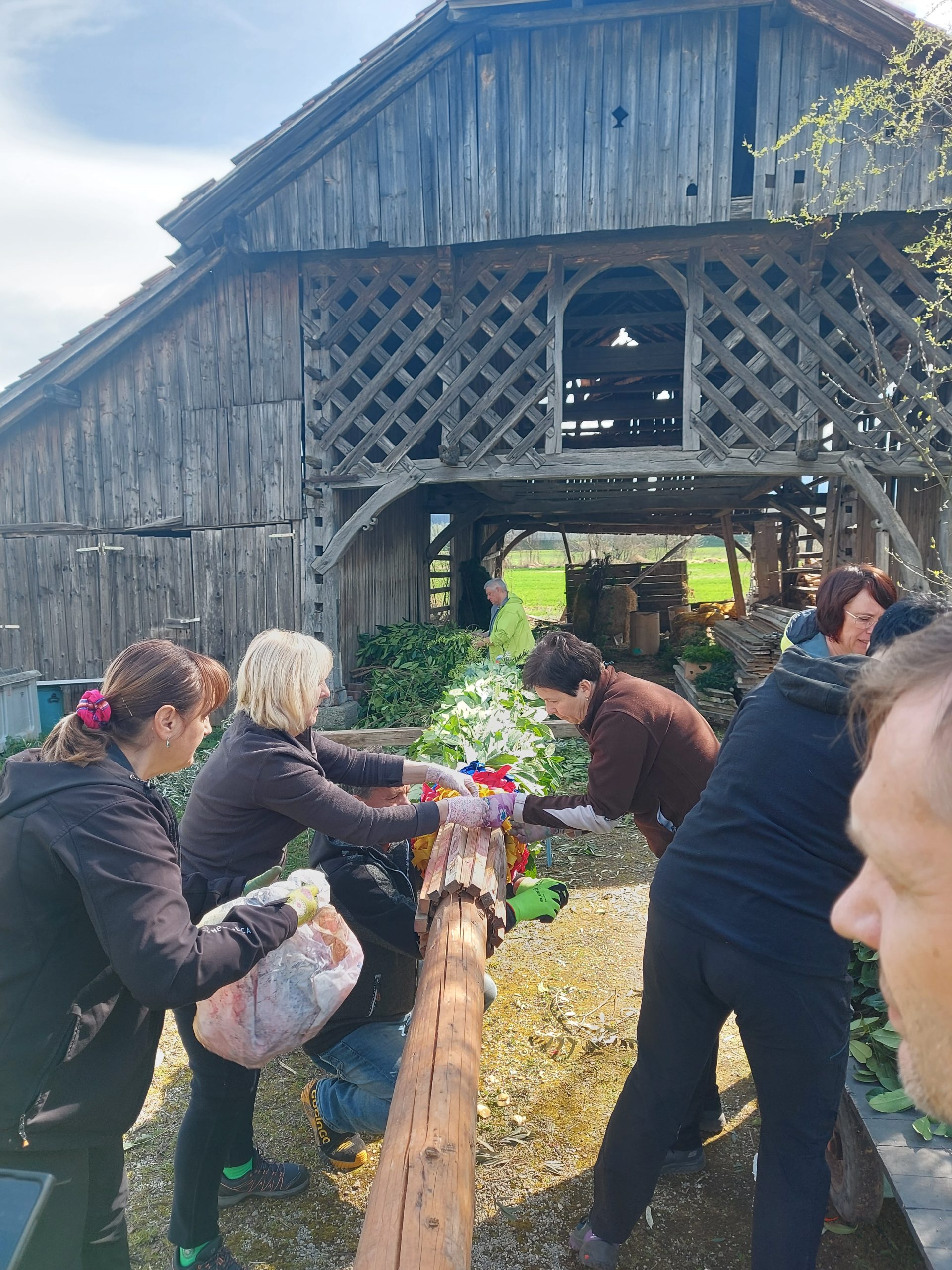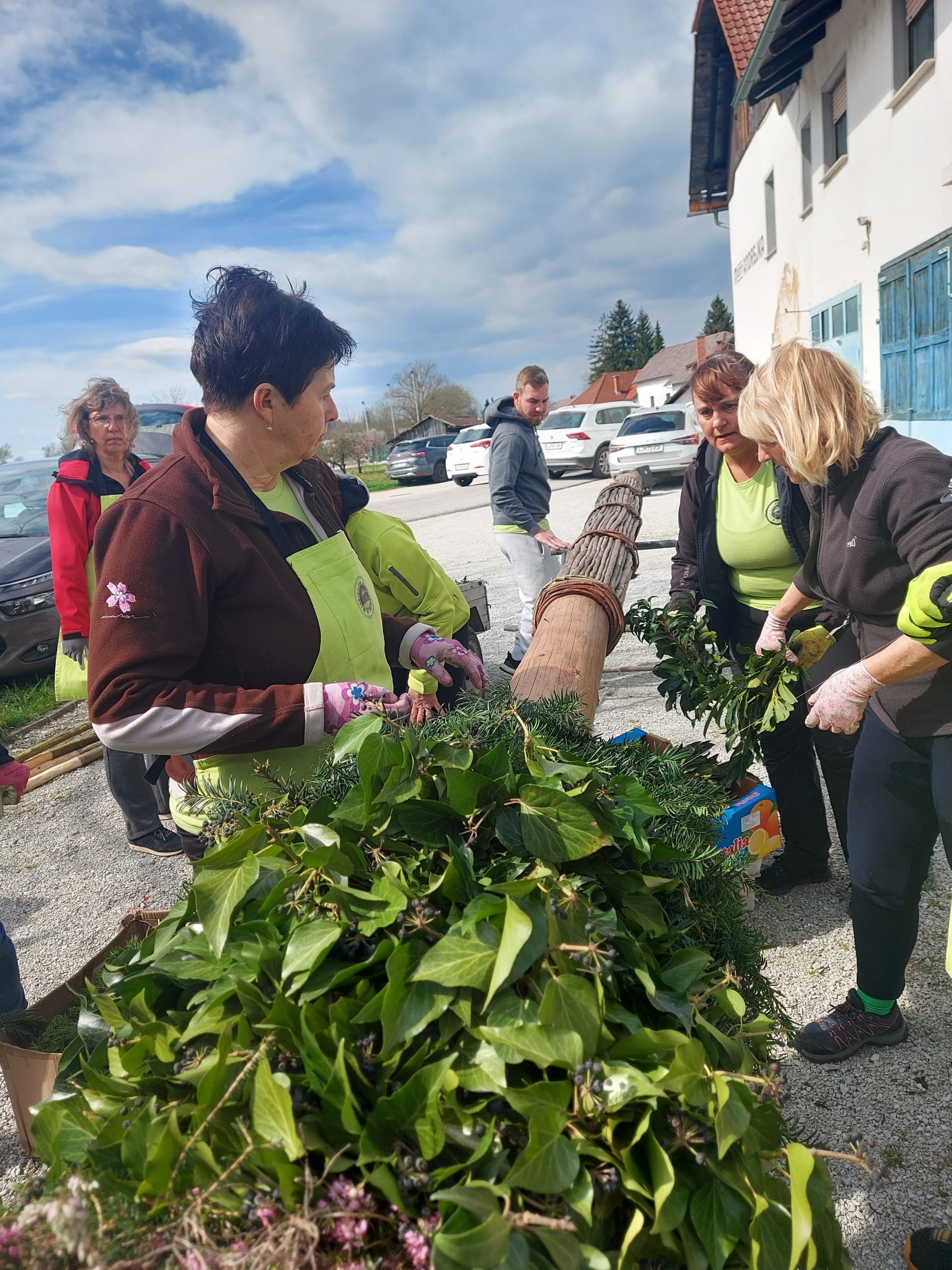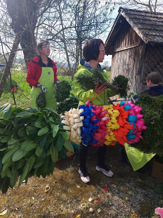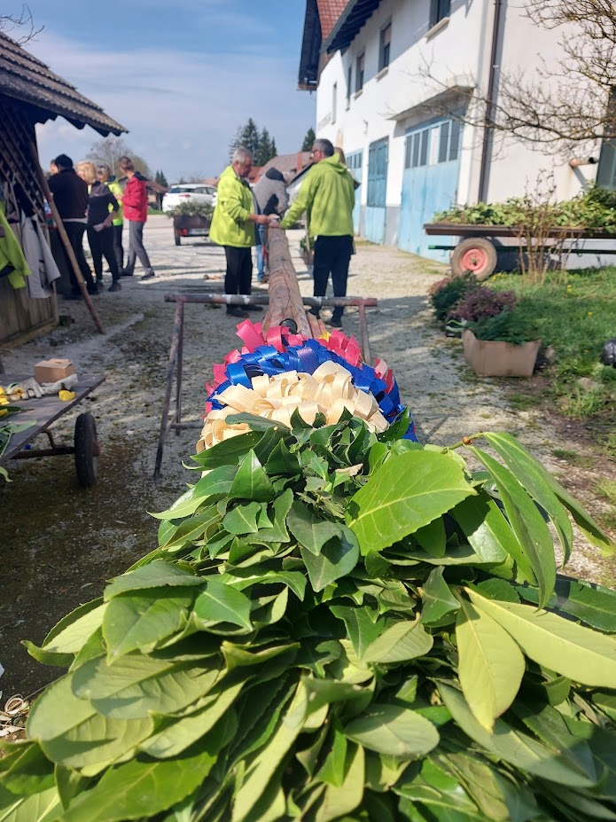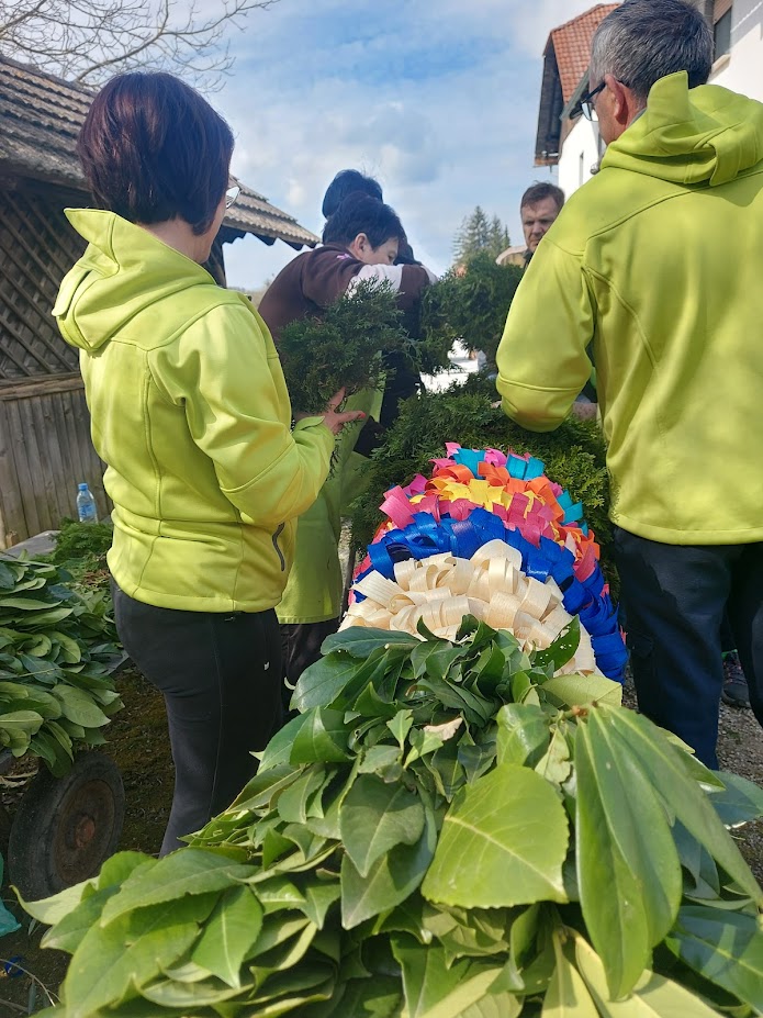 Pred cvetno nedeljo smo naše moči združili v pripravo butare. Priprave se pravzaprav začnejo že nekaj tednov prej s pozivi za zbiranje zelenja. Nato se v petek pred cvetno nedeljo zberemo člani in simpatizerji društva, saj je kar nekaj pridnih rok potrebnih, da se iz zelenja sestavijo šopki, ki jih potem naslednji dan vpletemo v veliko butaro. Desetine šopkov iz zelenja, barvni oblanci, resje, zastava, letos pa tudi krasna lesena plošča z logotipom krasijo našo butaro. Ko je butara pod kozolcem narejena, jo je potrebno odnesti do cerkve, kjer nas čaka še zadnji, morda celo najzahtevnejši del. Tukaj priskočijo na pomoč tudi gasilci in tovornjak z dvigalom, saj je potrebno butaro dvigniti in jo fiksirati, da trdno stoji na svojem mestu. V soboto zvečer župnik v okviru blagoslova zelenja, blagoslovi tudi butaro velikanko. Ponosni smo, da ohranjamo stare slovenske običaje in hvaležni vsem, ki nas podpirate in aktivno sodelujete pri tem.