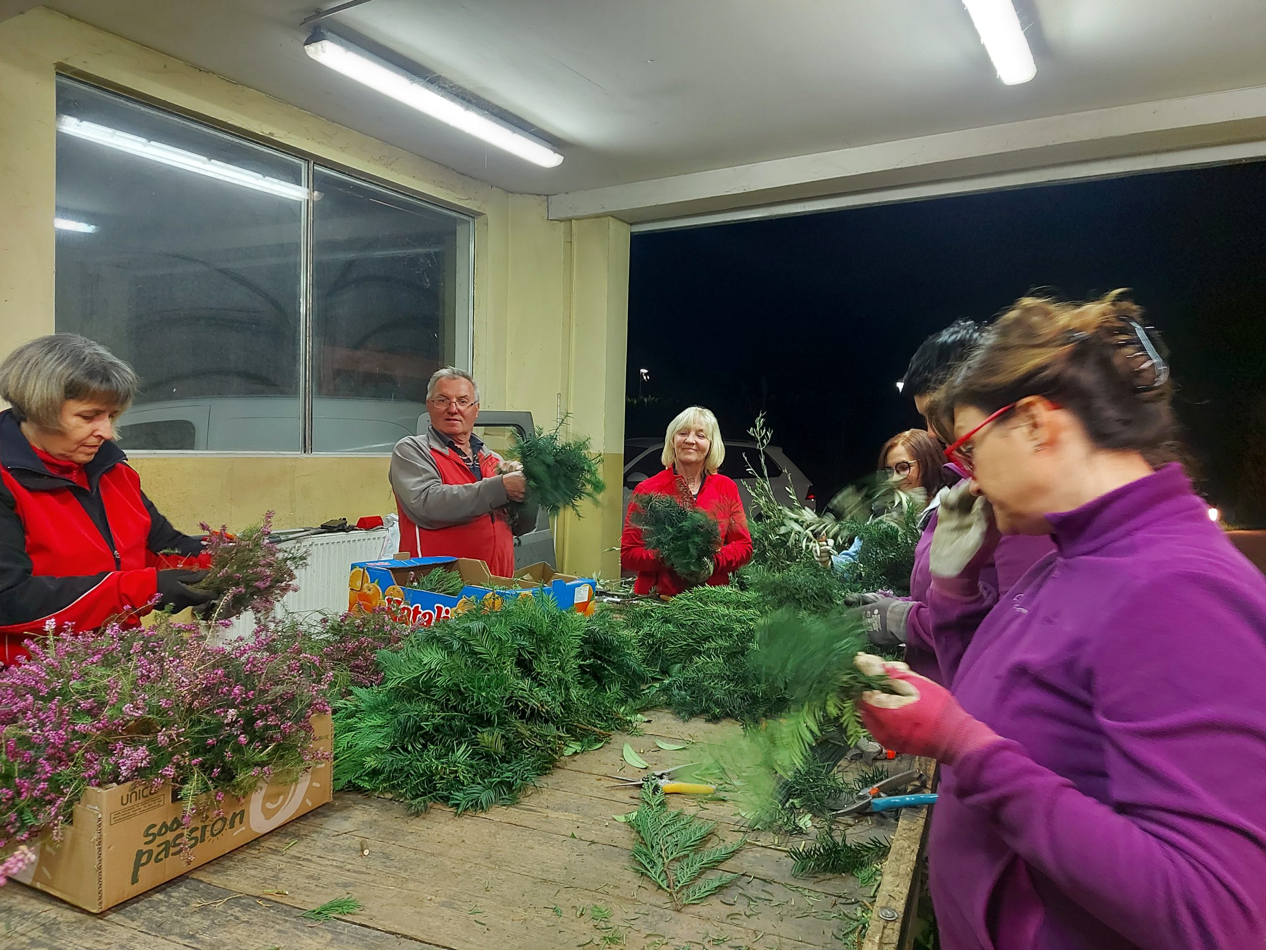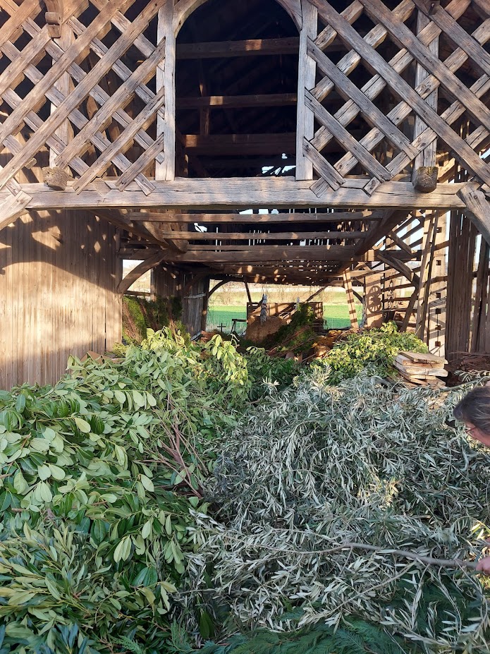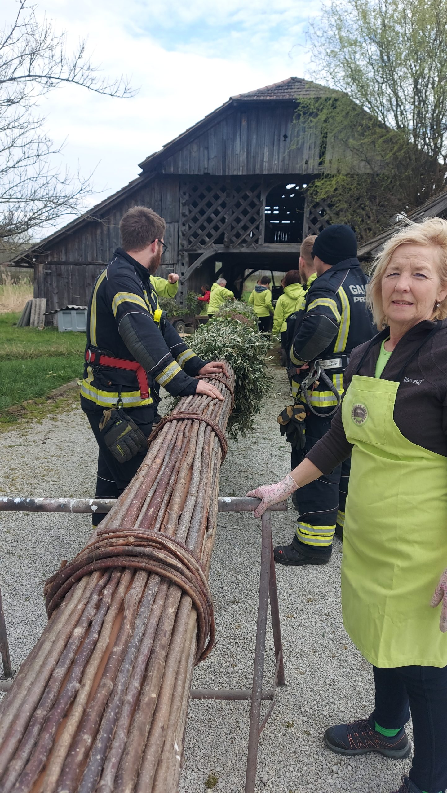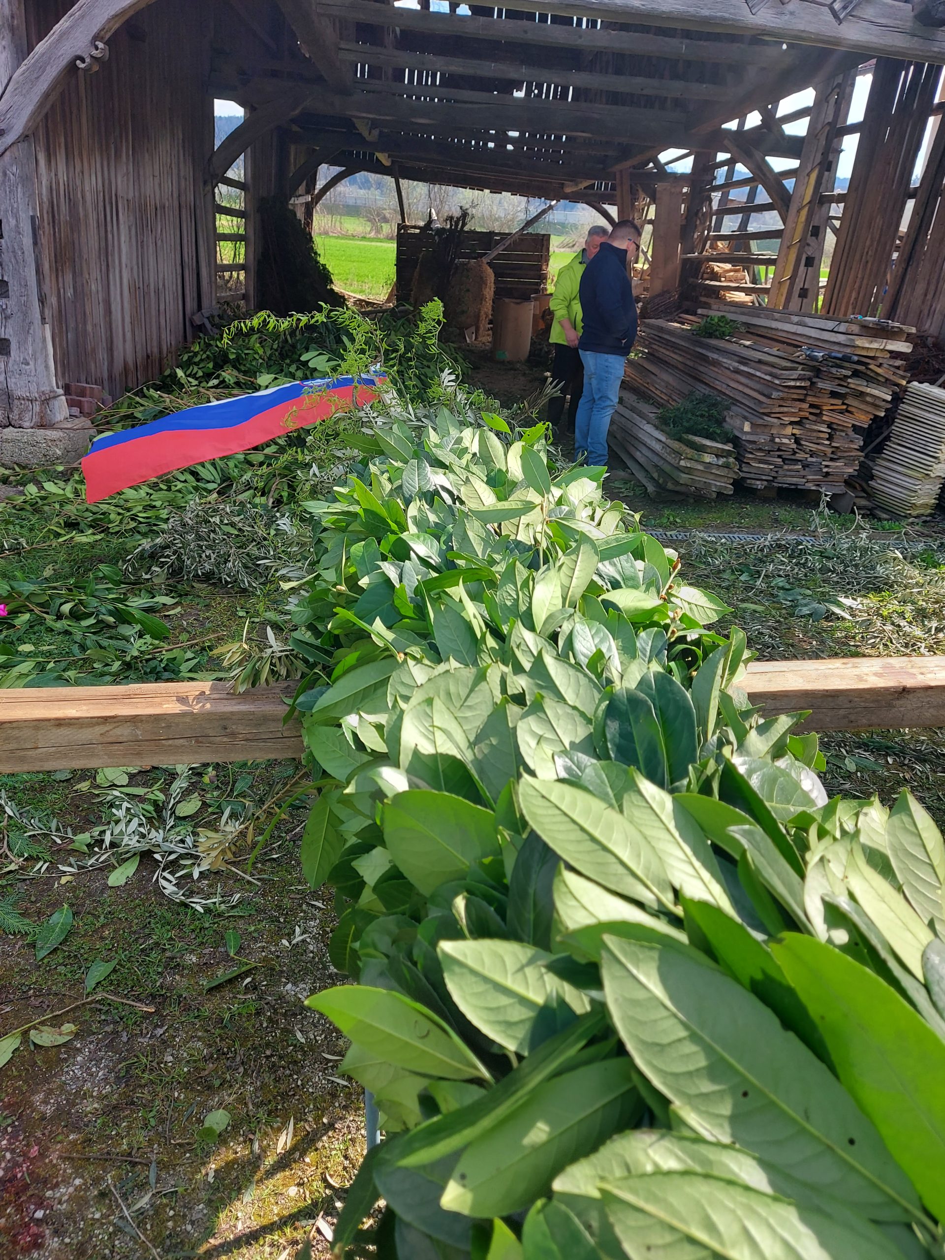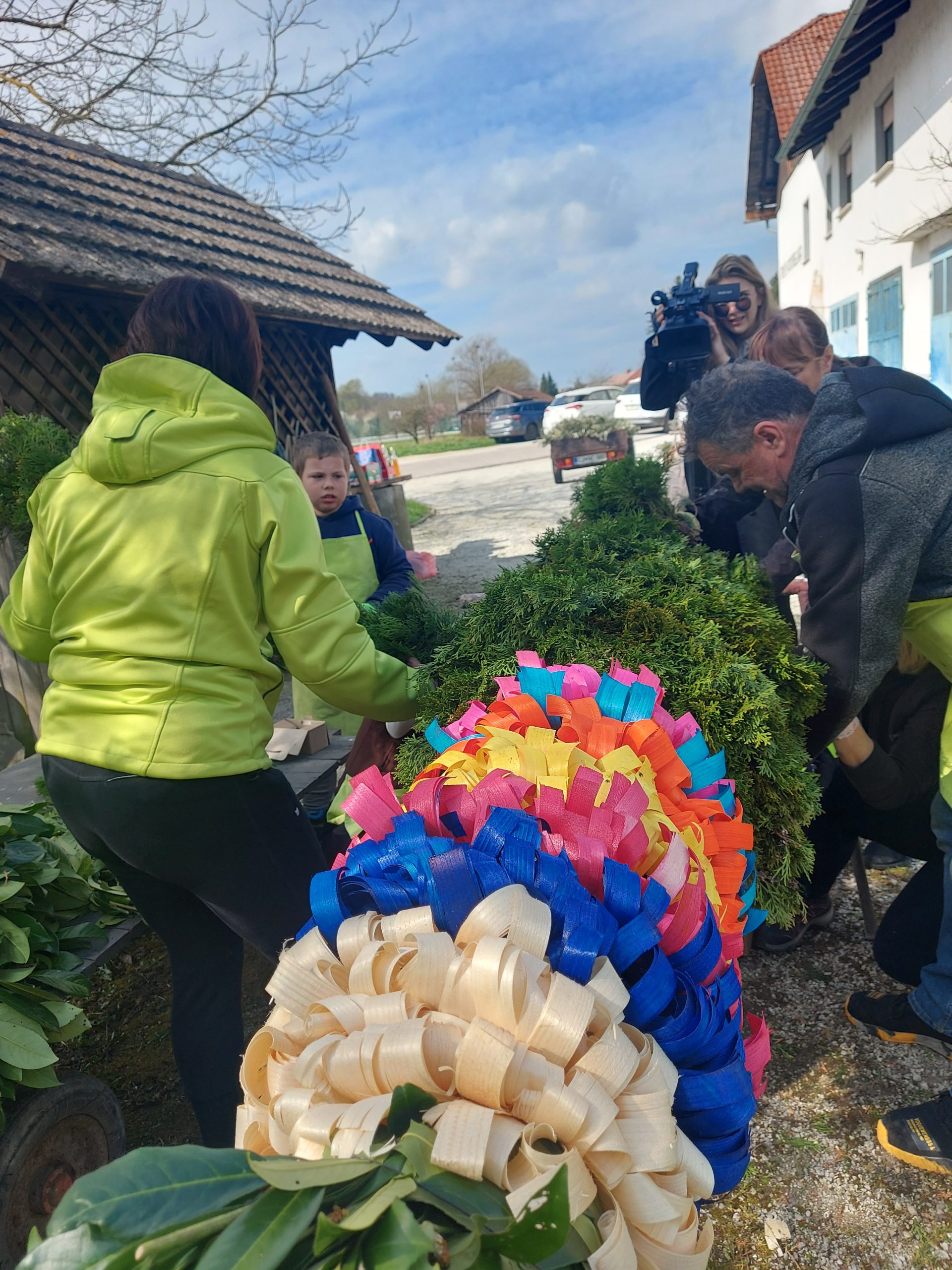 Pred cvetno nedeljo smo naše moči združili v pripravo butare. Priprave se pravzaprav začnejo že nekaj tednov prej s pozivi za zbiranje zelenja. Nato se v petek pred cvetno nedeljo zberemo člani in simpatizerji društva, saj je kar nekaj pridnih rok potrebnih, da se iz zelenja sestavijo šopki, ki jih potem naslednji dan vpletemo v veliko butaro. Desetine šopkov iz zelenja, barvni oblanci, resje, zastava, letos pa tudi krasna lesena plošča z logotipom krasijo našo butaro. Ko je butara pod kozolcem narejena, jo je potrebno odnesti do cerkve, kjer nas čaka še zadnji, morda celo najzahtevnejši del. Tukaj priskočijo na pomoč tudi gasilci in tovornjak z dvigalom, saj je potrebno butaro dvigniti in jo fiksirati, da trdno stoji na svojem mestu. V soboto zvečer župnik v okviru blagoslova zelenja, blagoslovi tudi butaro velikanko. Ponosni smo, da ohranjamo stare slovenske običaje in hvaležni vsem, ki nas podpirate in aktivno sodelujete pri tem.